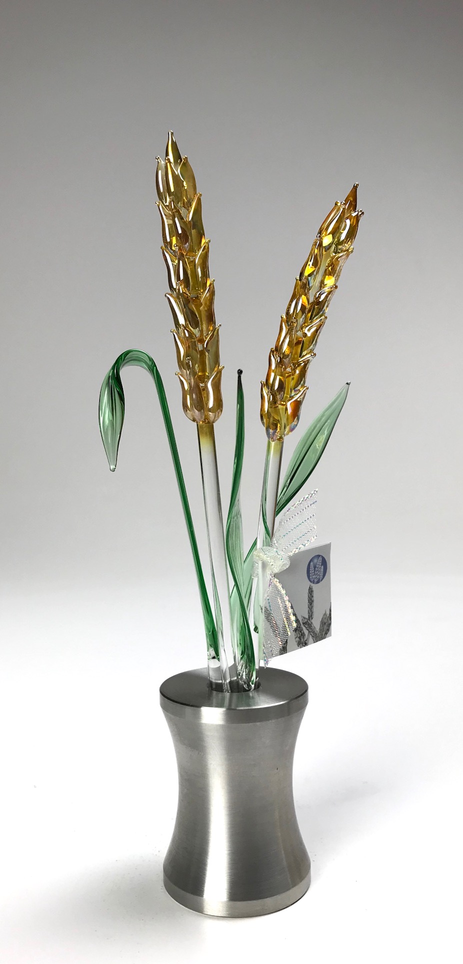 2 Amber/Gold/Green glass wheat & 3 leaves in mini stainless steel vase, (Made on site). 7 1/2 inches tall. White gift Box and info tag